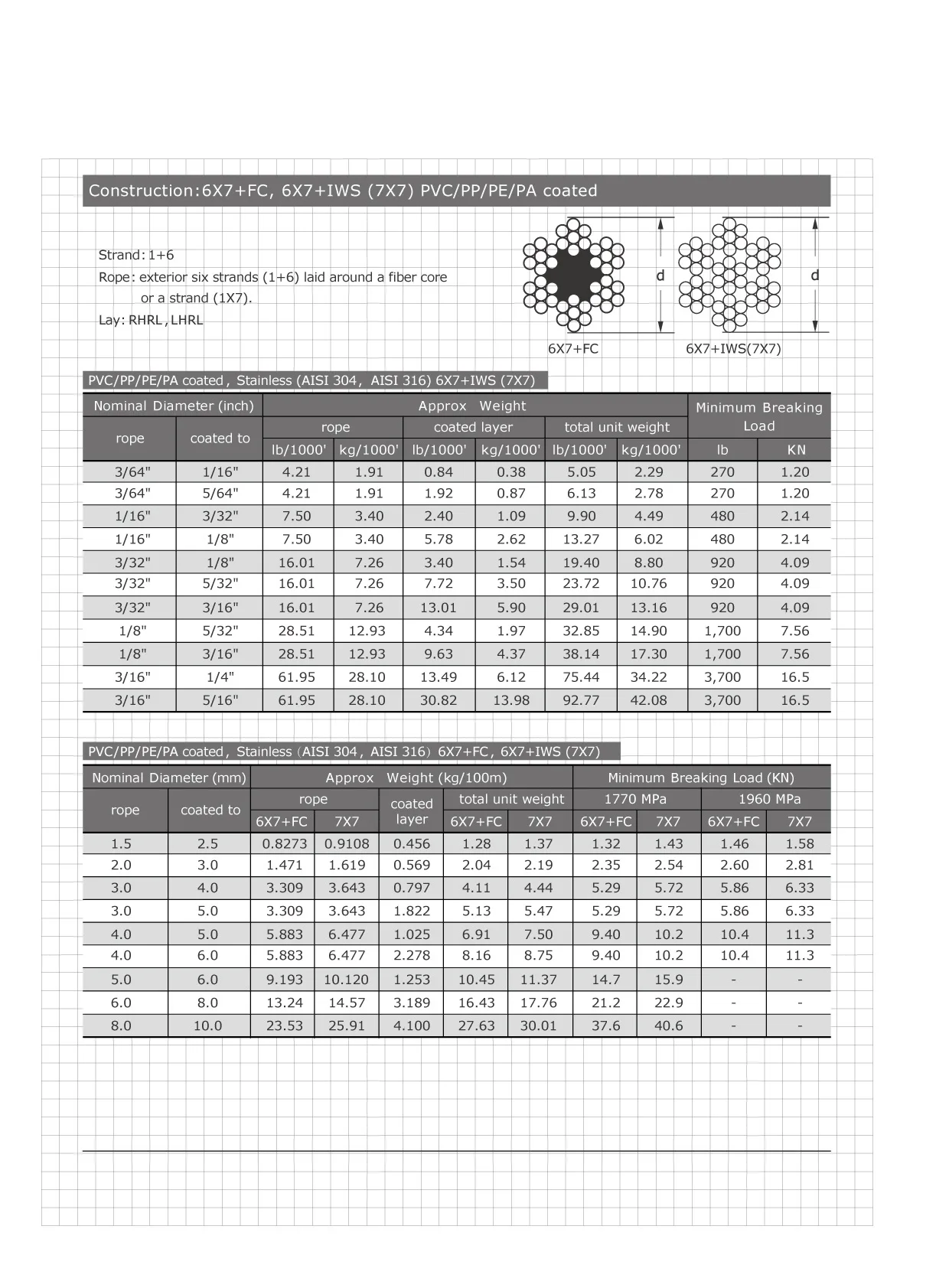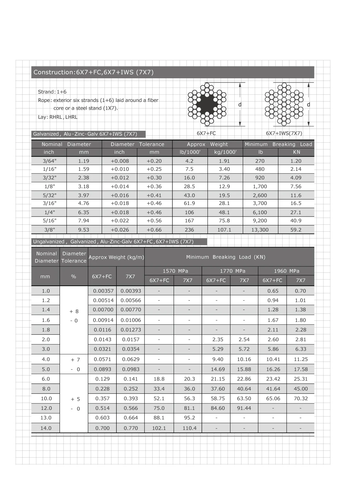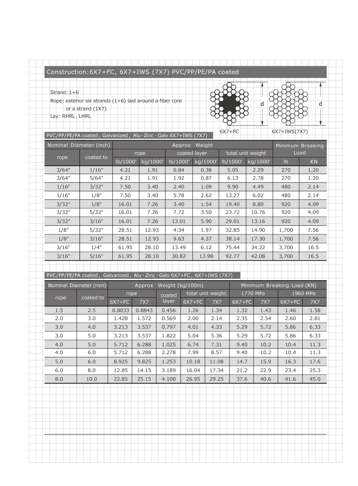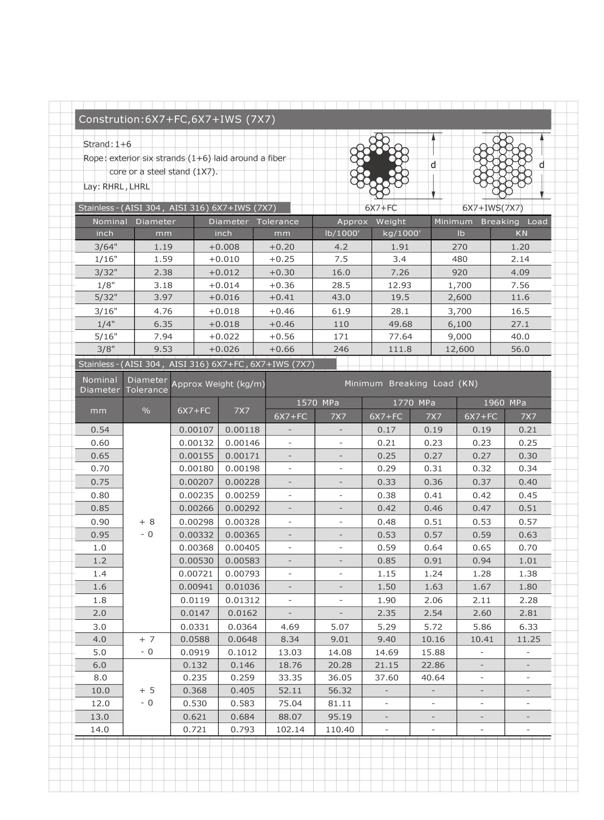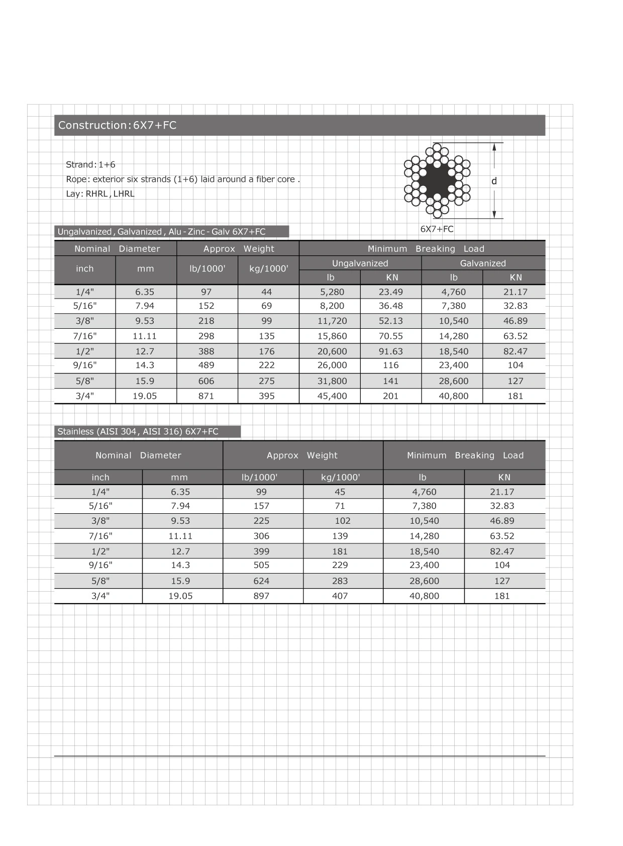 Rope: exterior six strands (1+6) laid around a fiber core or a steel strand (1X7)